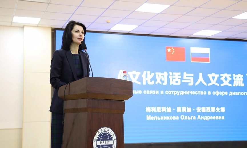 3月21日,中俄大学生前往哈尔滨远东理工学院参加专题讲座《文化对话与人文交流》,主讲人俄罗斯驻中国大使馆文化参赞梅利尼科娃·奥莉加·安德烈耶夫娜女士向同学们介绍了俄罗斯丰富多彩的文化,并讲述了中国优秀传统文化对于俄罗斯文化的影响。
