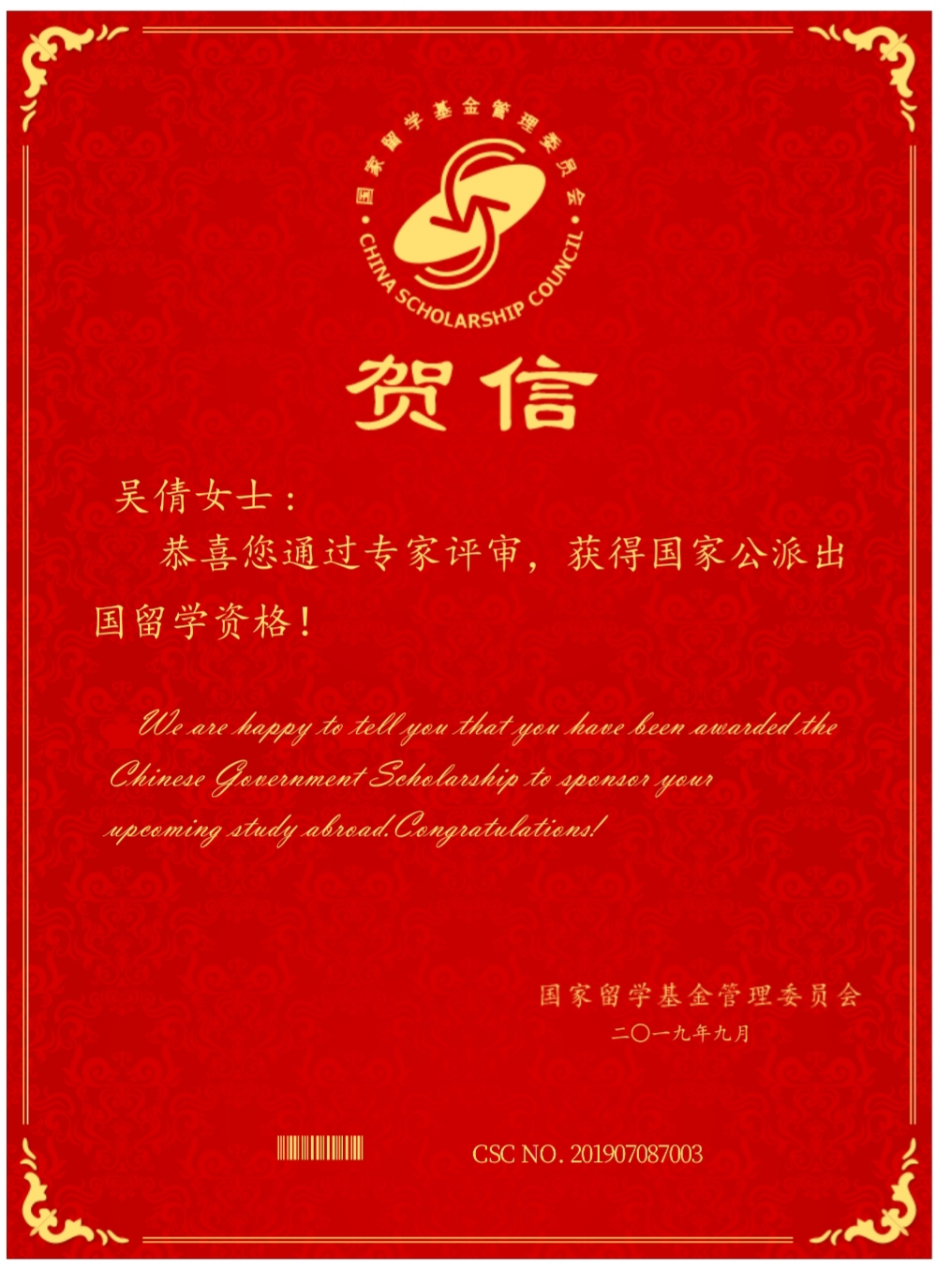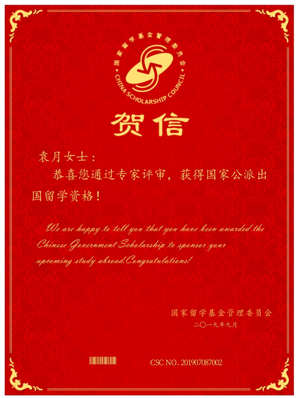 通讯员 袁月)根据国家留学基金委2019年度中俄政府奖学金项目相关要求,遵照我校国际交流部工作部署,经过俄语专业学生自愿申请,外国语学院选拔,学校复核,学生网上申报,留学基金委专家评审以及俄罗斯联邦教育部相关部门审核,9月1日,国家留学基金委在网上发布录取通知,我院17级俄语专业1701班3名同学入围国家留学基金委2019年度中俄政府奖学金项目资助名单,他们分别是:袁月(201721110275)、吴倩(201721110225)、周开妍(201721110292)。
