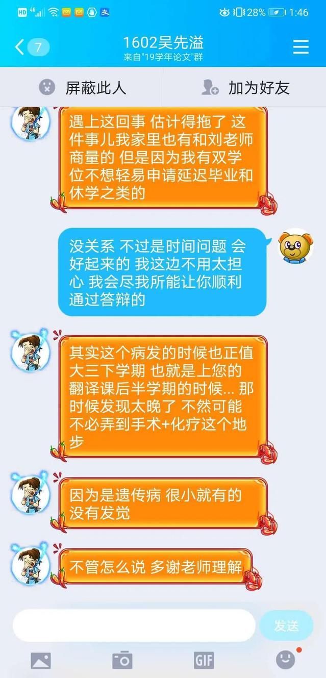 指导教师薛凌老师了解情况后,一直安抚他,让他不要着急沮丧,并不断耐心提供写作建议,鼓励他按时提交初稿,争取参加答辩。学院副院长袁奇、党委副书记余向阳一直关注他的情况,并与其父亲通话,表示慰问和鼓励。