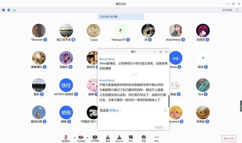 茶话会上,毕业生们畅所欲言,分享了大学成长的点点滴滴和毕业感言,表达了对学校和老师的感恩之情和深深祝福。大家纷纷表示,毕业后将牢记老师们的叮咛和嘱托,不辜负母校的期望,开启人生的新篇章。俄语1601班的倪文静表示:“非常感谢老师们和同学们一起举办了这次线上茶话会活动,大家毕业时都有千言万语想要表达,不管是大四学生的经验之谈或者是惋惜之情,都让我感觉到大学的美好,感谢中南财经政法大学外国语学院俄语系让我们相遇相知相识,共同成长!”