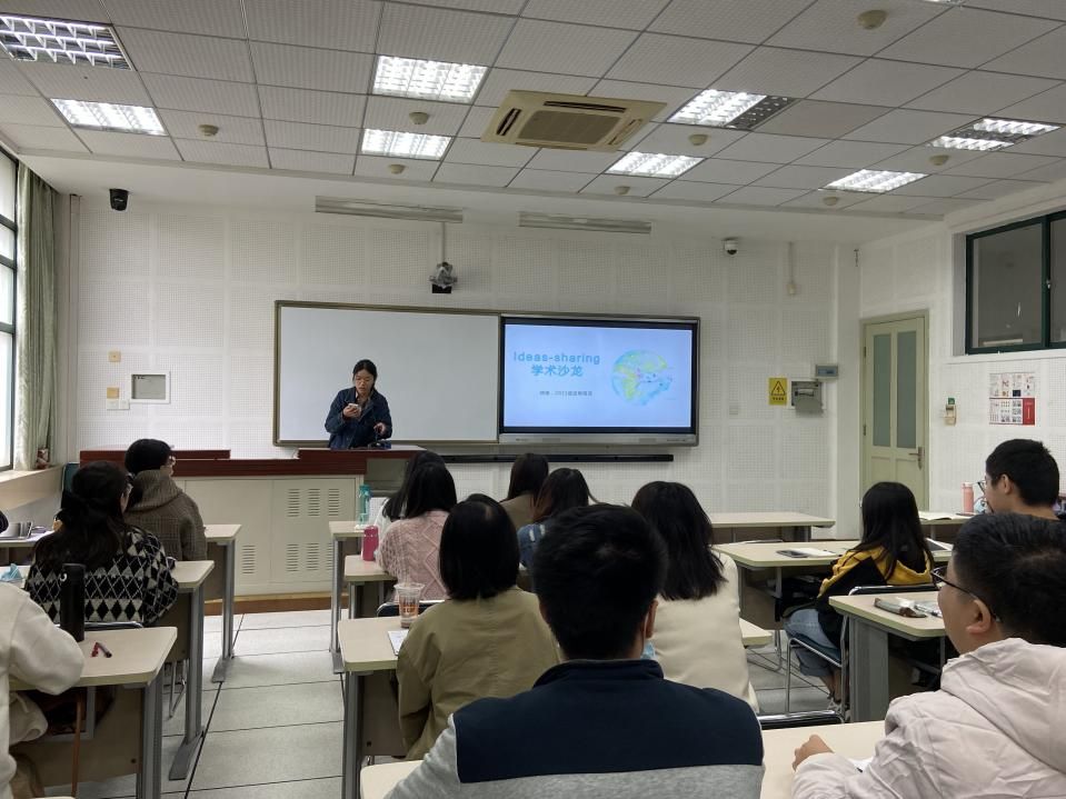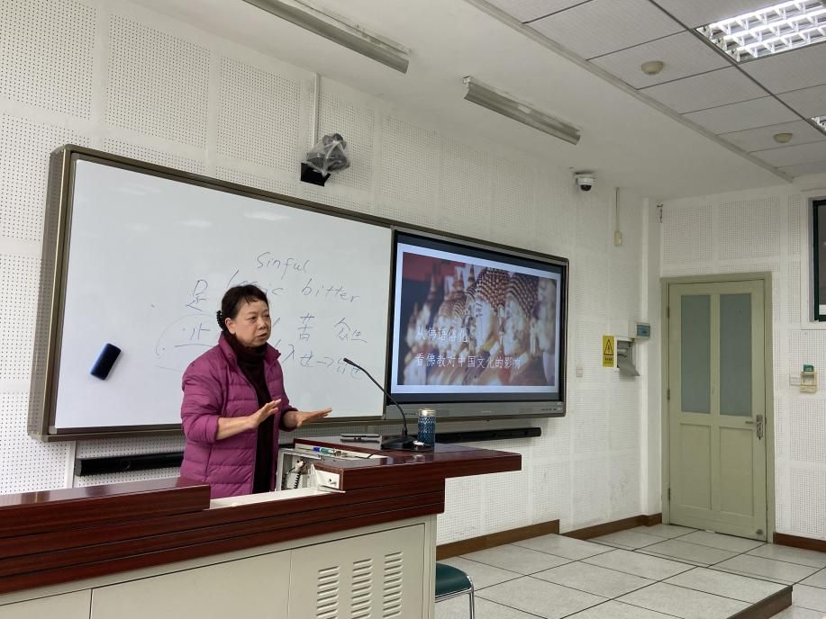 (通讯员 曲艺)2021年10月21日,导学学术下午茶——“从佛语俗话看佛教对中国文化的影响”学术沙龙在文波楼语音210教室开展。英语语言文学导师组陈立华教授和2021级通用笔译全体研究生参与本场学术沙龙。来自通用笔译专业的四位同学王乔露、邓芳莉、王梦丽、李腾荣就中国哲学、现代汉语、中国文学、世俗信仰等四个方面展开了讨论。沙龙由张品懿同学主持。