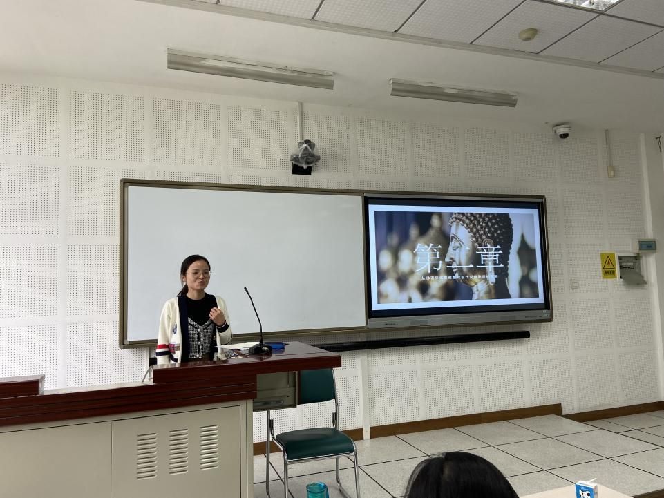 随后,王乔露同学以现代汉语熟语作为出发点,介绍了佛教对我们现代汉语词汇的巨大影响。如今形容人罪大恶极的词语“十恶”就是来自佛语。同时她还举例了一些我们耳熟能详的熟语如“不看僧面看佛面,不看鱼情看水情”等,这些我们如今生活中常用的熟语也是来源于佛教。最后,王乔露同学总结说佛教使得现代汉语词类更加丰富,它不仅提升了汉语言的诙谐力,还增强了其表现力和韵味。