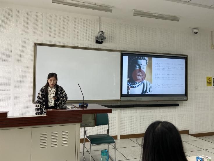 接着,邓芳莉同学为我们介绍了佛教对中国文学的影响。她对比分析了《欢喜国王缘》和《长恨歌》,得出这两部作品都是帝王妃子故事题材,而且故事内容雷同,她指出佛教文学对中国古代文学有一定的借鉴意义。接着,她举例说明中国古代许多文学作品都有佛教的影子,比如《水浒传》中的“打得宋江一佛出世,二佛涅槃”、《西厢记》中的“相思事,一笔勾”等。这些都说明了佛教文化对中国古代文学产生了巨大的影响。