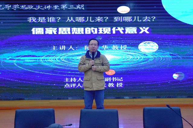 讲座伊始,王芹副书记指出“我是谁?从哪儿来?到哪儿去?”的问题是人们千百年来一直追寻探索的问题,当今社会,儒家思想也展示出新解释与新内涵,对我们的学习生活有新的启迪。陈立华教授在学院从事英语语言文学和中国传统文化的教学科研工作多年,深受同学们喜爱,陈教授的讲座将为学院师生带来一场精彩的精神盛宴。