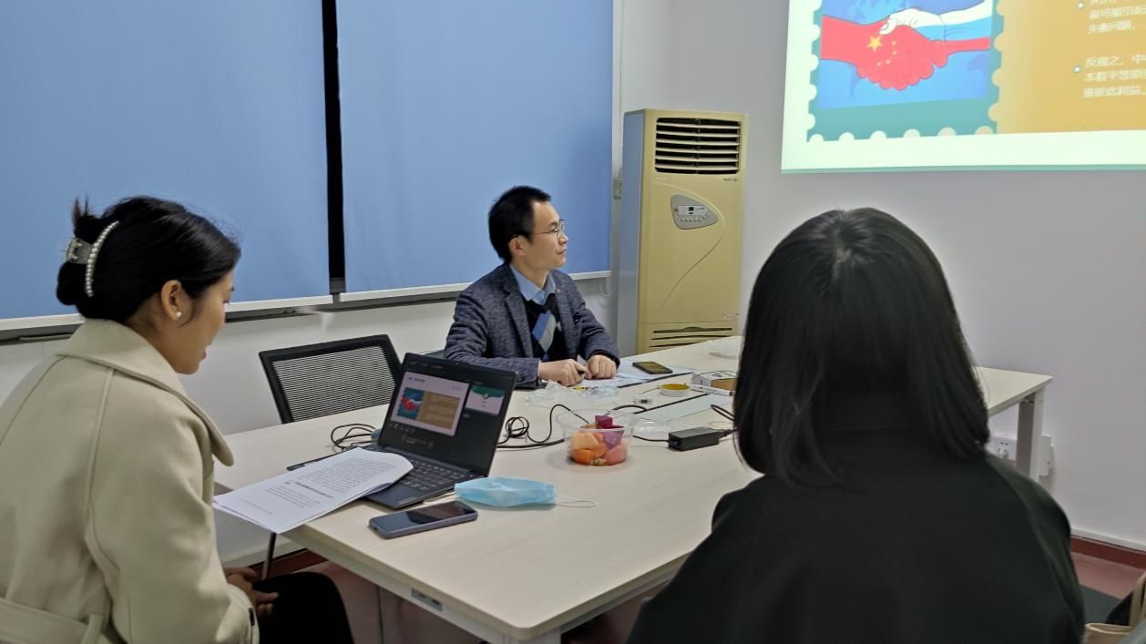 (通讯员 邵文文 李星雨)2021年11月25日晚六点,导学学术下午茶——“建构主义视角下新时代中俄全面战略协作伙伴的建构”学术沙龙在外国语学院学术研究中心214室开展。国别与区域研究导师组蒙曜登老师及国别与区域研究、翻译学等两个方向的20级研究生参加了本次活动。