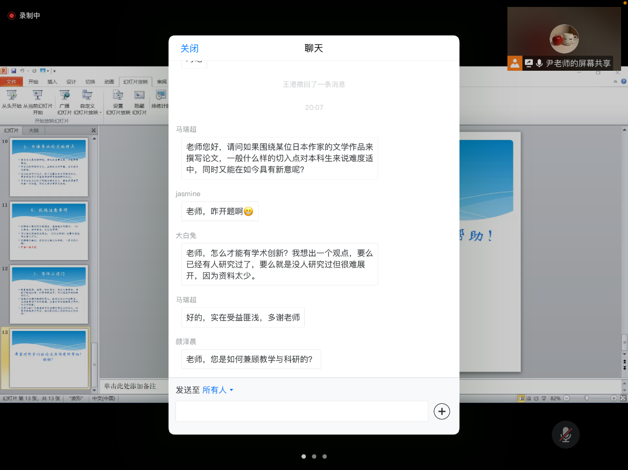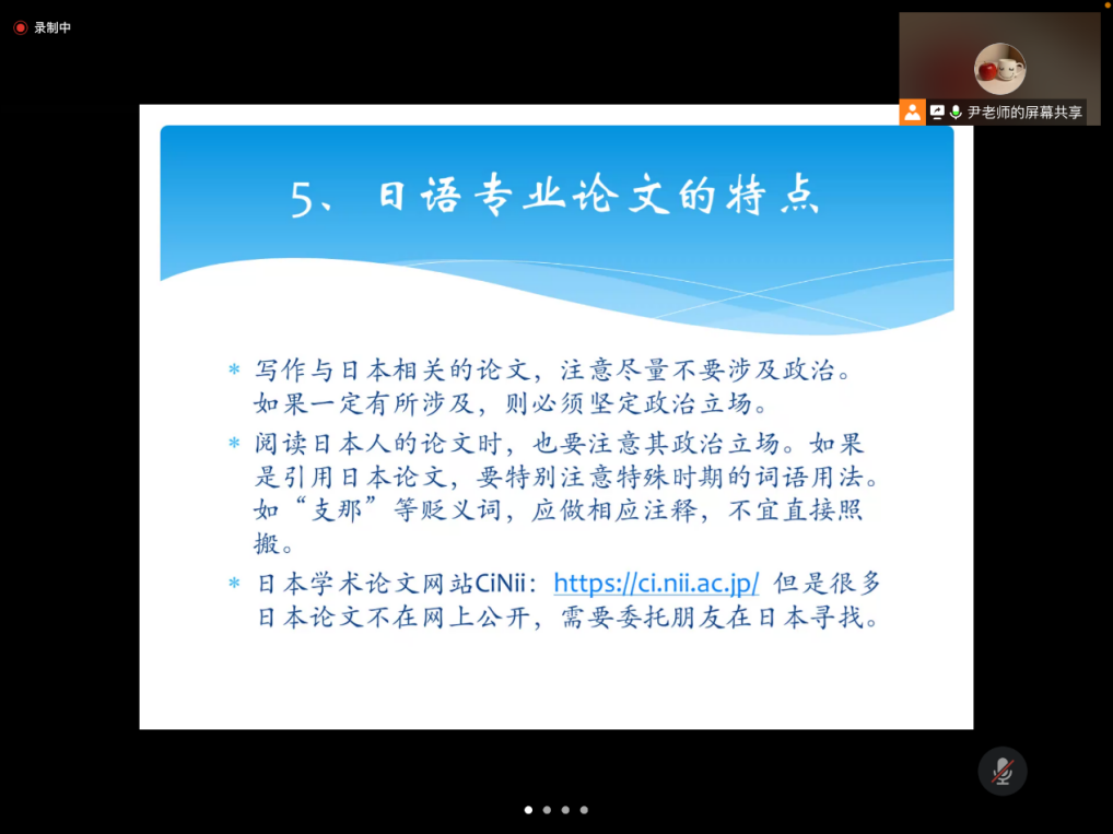 (通讯员 任奎玲)2021年12月9日19:00,导学学术下午茶在腾讯会议开讲。本次活动由日语语言文学专业授课教师尹蕾博士担任主讲嘉宾,以《日语专业学术论文写作指导》为题,2020和2021级日语语言文学研究生共同参与。