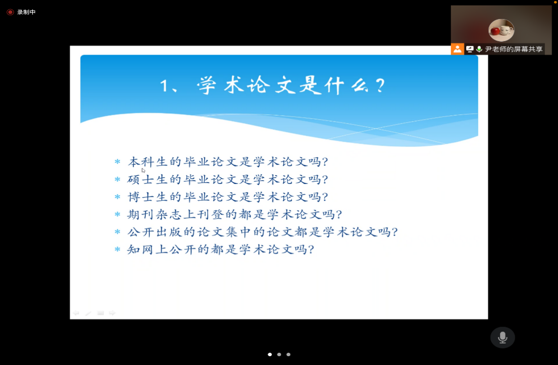 活动伊始,尹蕾老师以“本科生的论文是否属于学术论文”一问导入今天的主题——日语专业学术论文写作指导。针对提问,同学们进行了积极的讨论,尹老师随后给出了学术论文的定义:学术论文是对某个科学领域中的学术问题进行研究后表述科学研究成果的理论文章,具有学术性、科学性、创造性以及学理性,其内容应有所发现、有所发明、有所创造、有所前进,而不是简单的重复、模仿或者抄袭前人的工作。