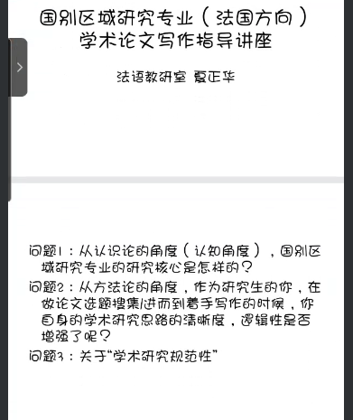 之后,夏老师介绍了中法建交50周年互推“最有影响力书籍”,并建议细读经典,研读新知,开拓新知。最后,夏老师对学术研究规范性提出要求,研究生应着手于多方面,培养做人、做事、做文章的能力。同学们在交流互动环节积极与夏老师交流。李星雨同学就毕业论文选题的范围向老师提问,夏老师回答了该问题,同时也根据学生的研究方向和兴趣提供了一些选题的思路和观点。