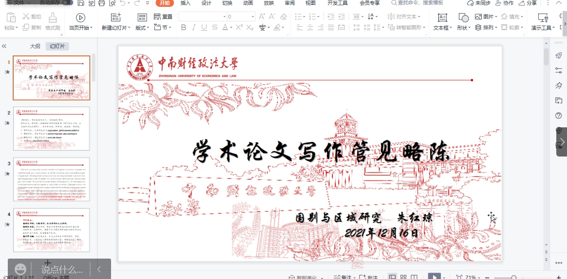 (通讯员 陈炫宇)2021年12月18日14:00,导学学术下午茶第十期在线上腾讯会议开展。本次活动由国别与区域研究导师组组长朱红琼教授担任主讲嘉宾,以“学术论文写作管见略陈”为题,为国别与区域研究专业全体2020级、2021级研究生带来了一场别开生面的线上讲座。