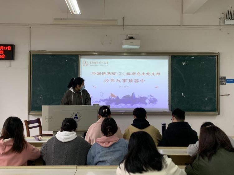 院网讯(通讯员:薛文涛)2022年3月17日下午3:00,外国语学院研究生2021级党支部于文添楼101教室顺利开展了“外语说中国—讲中国好故事”活动第一期。党支部书记刘睿与组织委员余星燃分别以“经典党史故事”与“先进典型故事”为题,向支部全体同志进行了分享。