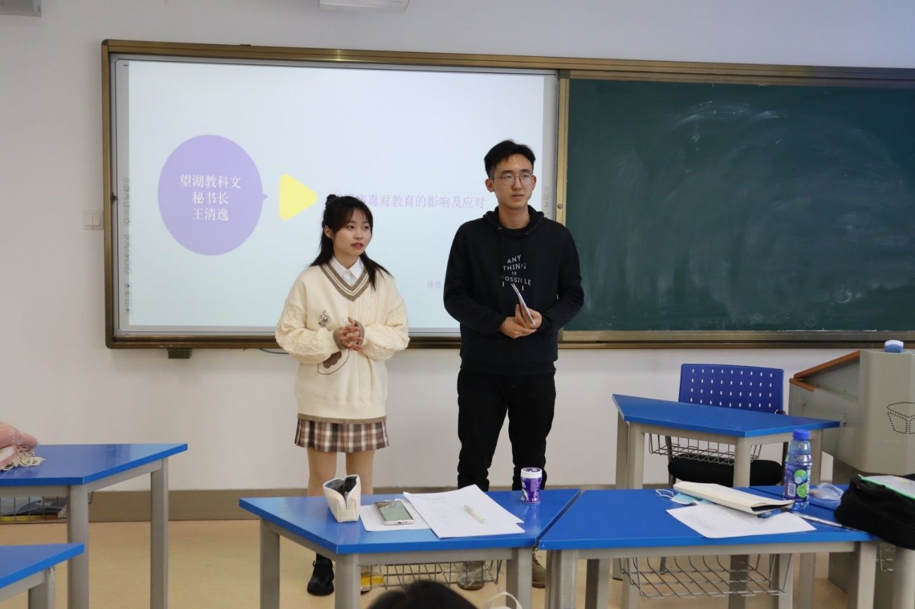 “望湖市教育局局长”莫惠用中文讲述了学习型城市“停课不停学”的相关举措,译员为胡烜硕。