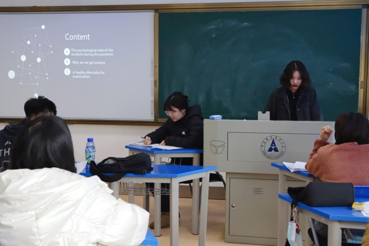“南湖心理学家”彭琪琪用英文讲述了疫情下如何缓解考试焦虑,译员为郑泽灵。