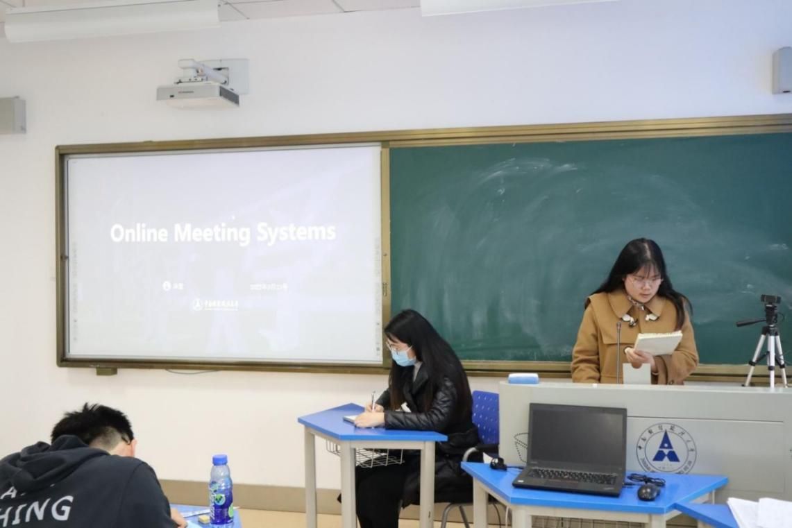 “南湖上市总裁”华萱用英文介绍了网络会议系统,译员为田淑颖。