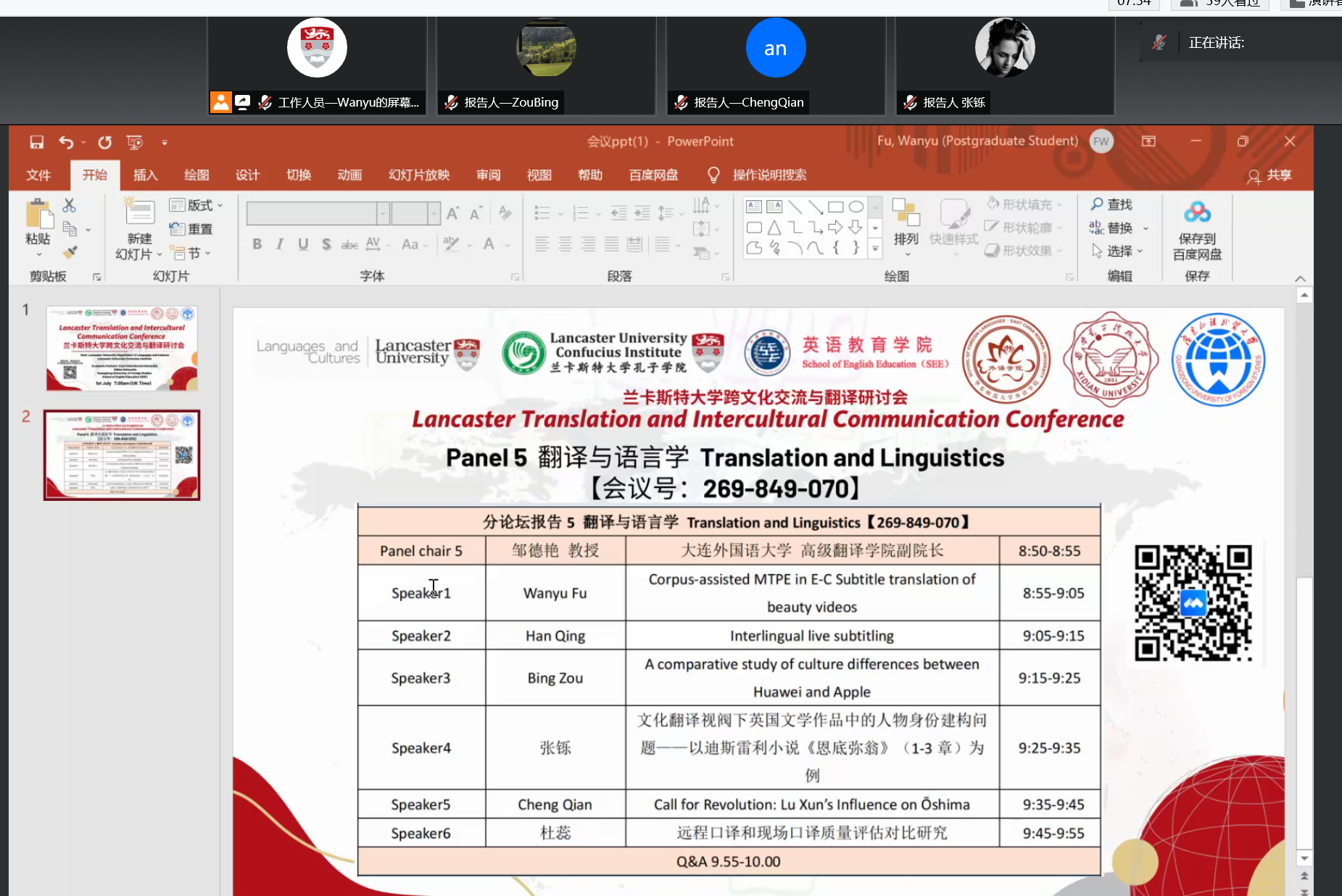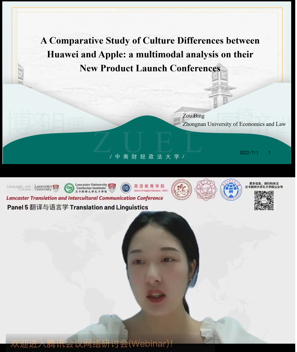 (通讯员 付煜琪)2022年7月1日伦敦时间7:00 (北京时间:14:00),兰卡斯特大学跨文化交流与翻译研讨会(Lancaster Translation and Intercultural Communication Conference)在云端举行,我院外国语言学及应用语言学研究生邹冰受邀参加会议,并在以“翻译与语言学”为主题的分论坛上宣读了论文。
