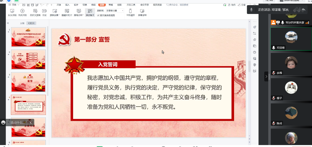 会上,邹冰带领支部全体党员重温了入党誓词,与会人员通过轮流诵读二十大报告原文、分享学习二十大报告心得体会等方式开展主题党日活动。