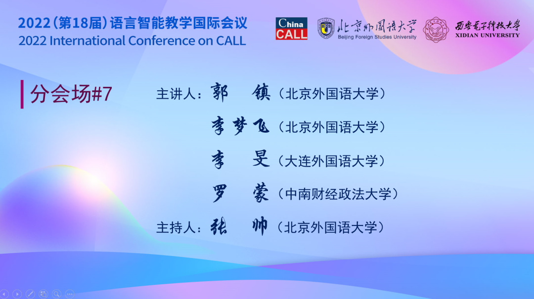 2022年11月11-13日,“2022(第18届)语言智能教学国际会议”成功举办。会议由中国英汉语比较研究会语言智能教学专业委员会(ChinaCALL)主办,北京外国语大学网络教育学院和人工智能与人类语言重点实验室、西安电子科技大学外国语学院和外语教育数字化研究院联合承办,《语言智能教学(英文)》国际期刊编辑部协办。大会主题为新兴技术与语言教育(Emerging Technologies and Language Education)。在阮全友教授的指导下,2022级外国语言学及应用语言学研究生罗蒙参与了此次国际学术会议,并在分会场作学术报告。