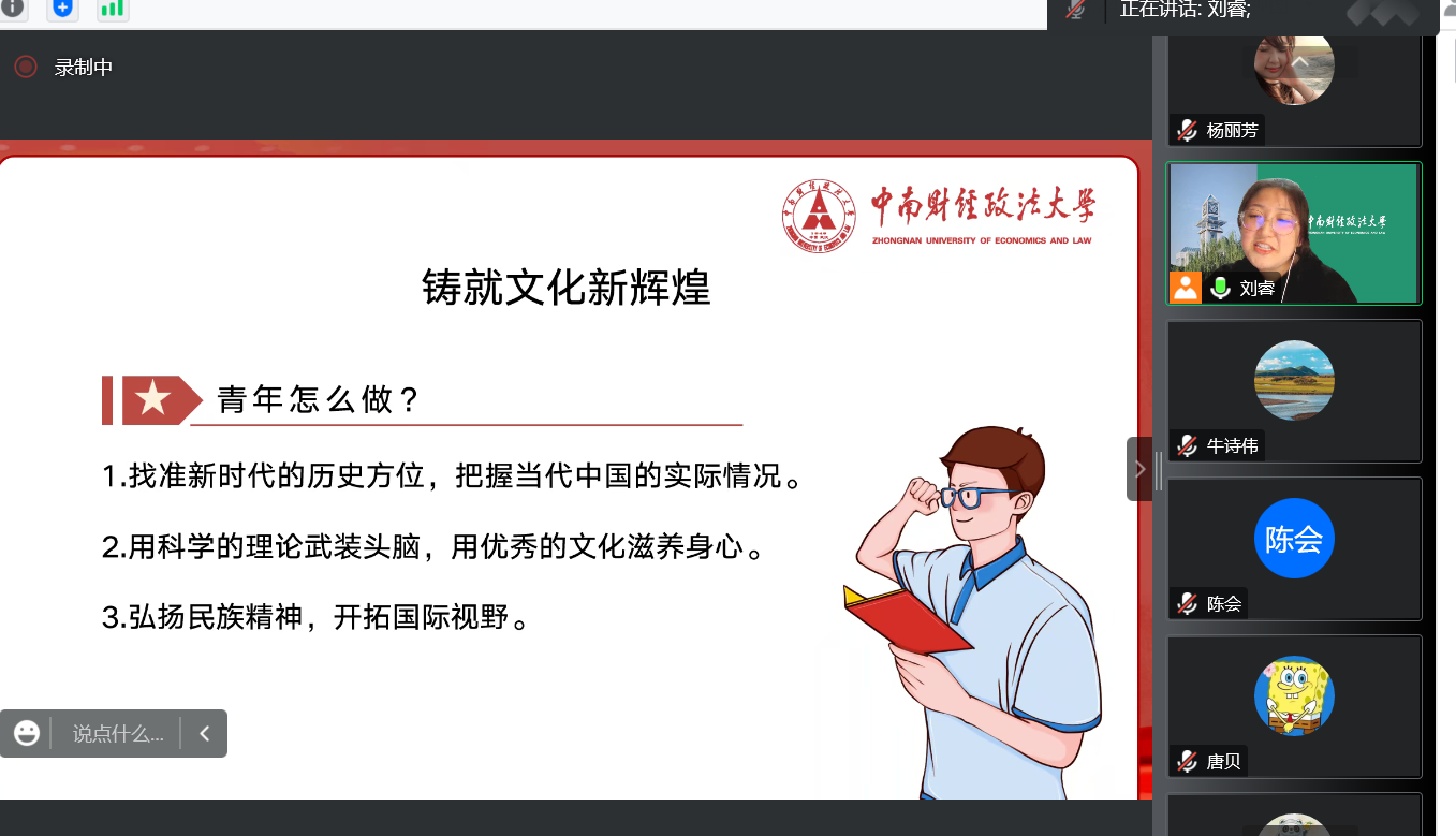 此次宣讲从文化自信、文化自强、文化发展变化以及如何铸就文化新辉煌这四个方面展开。结合党的二十大报告及十九大报告,刘睿对文化自信和文化自强进行了解读,带领党员同志们了解了中国的文化发展过程。同时,从外语专业及自身实际出发,一起感受中国人民文化自信逐步提升。中国国际地位日益提高,在国际文化舞台上发挥着越来越重要的作用。最后,刘睿带领支部成员一起结合青年实际,共同探讨了新时代青年应如何用自己的实际行动去铸就社会主义文化新辉煌。