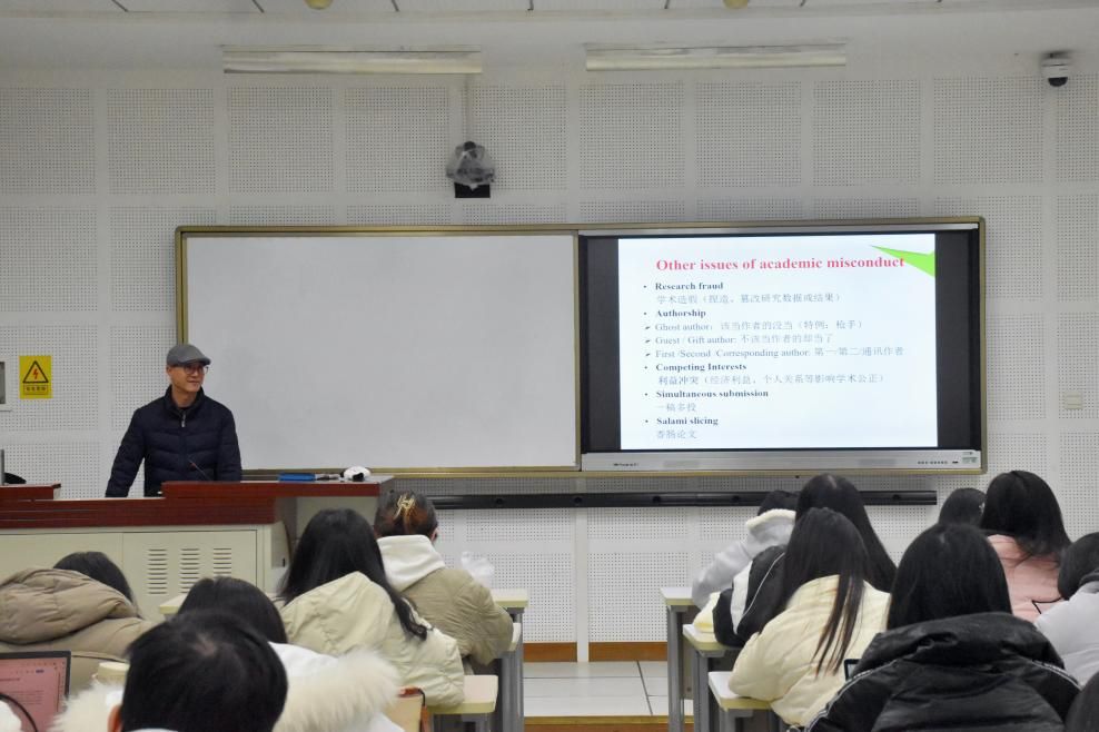 讲座伊始,黄开胜教授对讲座标题进行了解读,他认为,“冰上的舞者”意味着风险与成就共存,学术研究与写作同样如此,既需要专业知识技能,也应怀有如履薄冰的态度。接着,黄教授向同学们介绍了研究伦理,并告诫同学们在进行学术研究及写作时应该遵守学术道德和学术规范,避免学术不端行为。其中,他重点介绍了学术不端行为的表现形式,包括学术造假、抄袭、利益冲突、一稿多投、“香肠”论文等。最后,关于如何避免抄袭,他给出了自己的建议。他指出在论文写作前应该有意识地阅读,善用文献工具进行整理;在论文写作过程中,要学会引用和转述,避免语言的重复使用;在论文完成后应该注意核对检查。