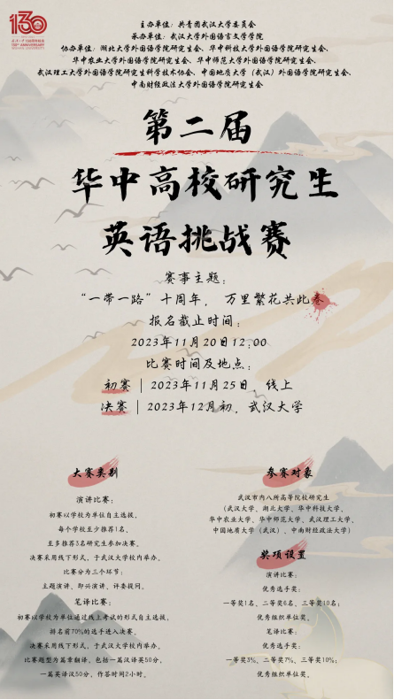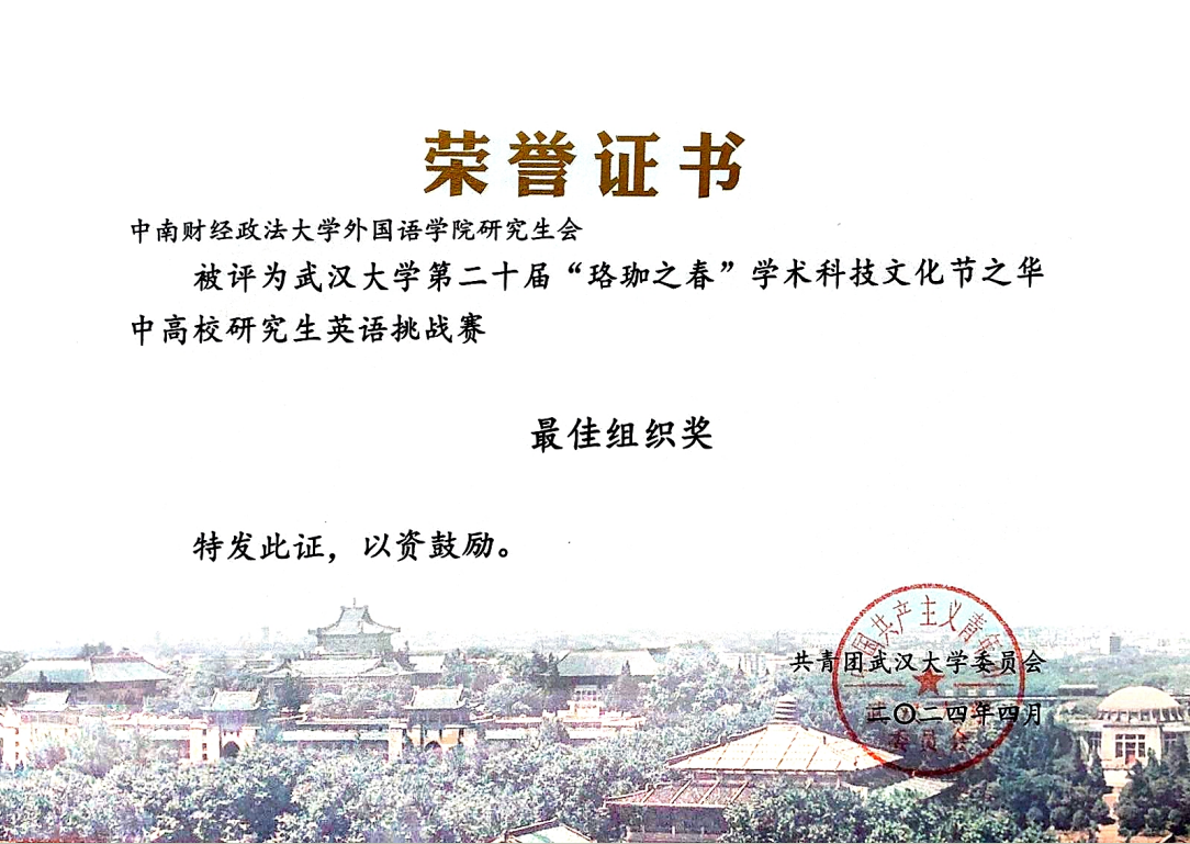 (通讯员 罗蒙)由共青团武汉大学委员会主办、武汉大学外国语言文学学院承办的第二届华中高校英语挑战赛近日顺利落幕。我院研究生会作为协办单位积极参与赛事组织工作,为全校研究生提供赛事服务,获武汉大学第二十届学术科技文化节“最佳组织奖”。