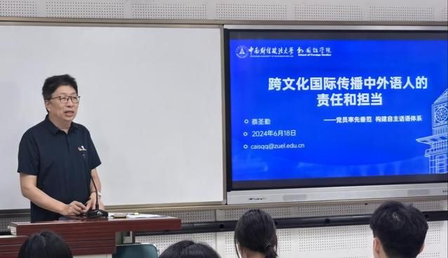 随后,蔡圣勤以《跨文化国际传播中外语人的责任和担当—党员率先垂范 构建自主话语体系》为主题讲授党课,他寄语毕业生党员在迈入新的人生阶段要担负新时代外语人才使命,继续发挥党员的先锋模范作用,增强廉洁自律意识,筑牢拒腐防变的思想防线,深挖中华优秀传统法治文化的精髓并在语言教育中率先实施,为话语体系建构做出贡献。