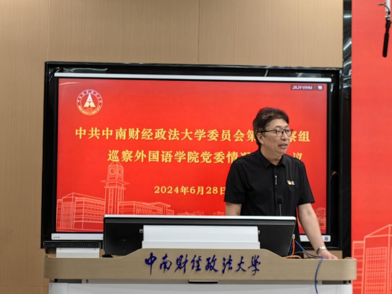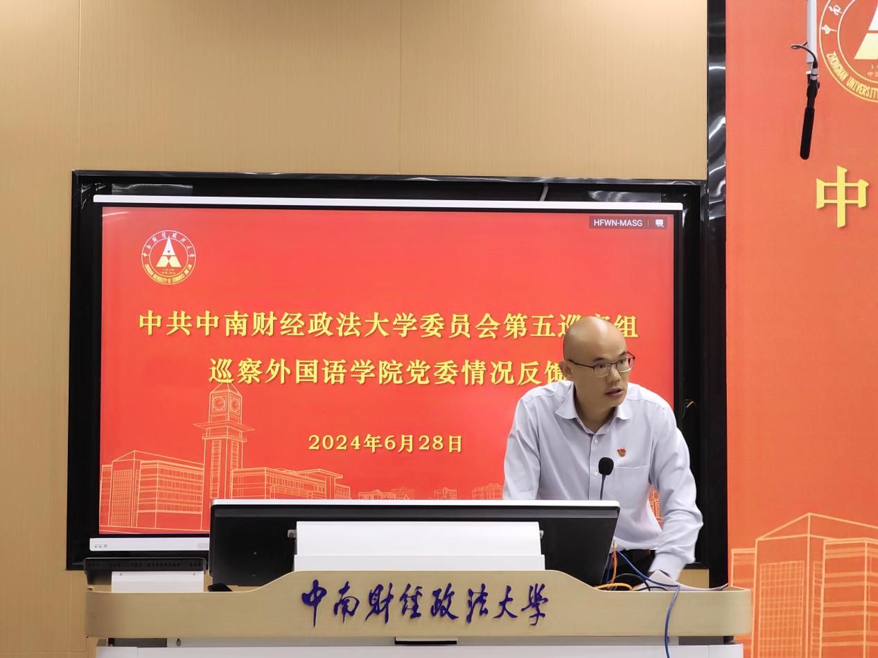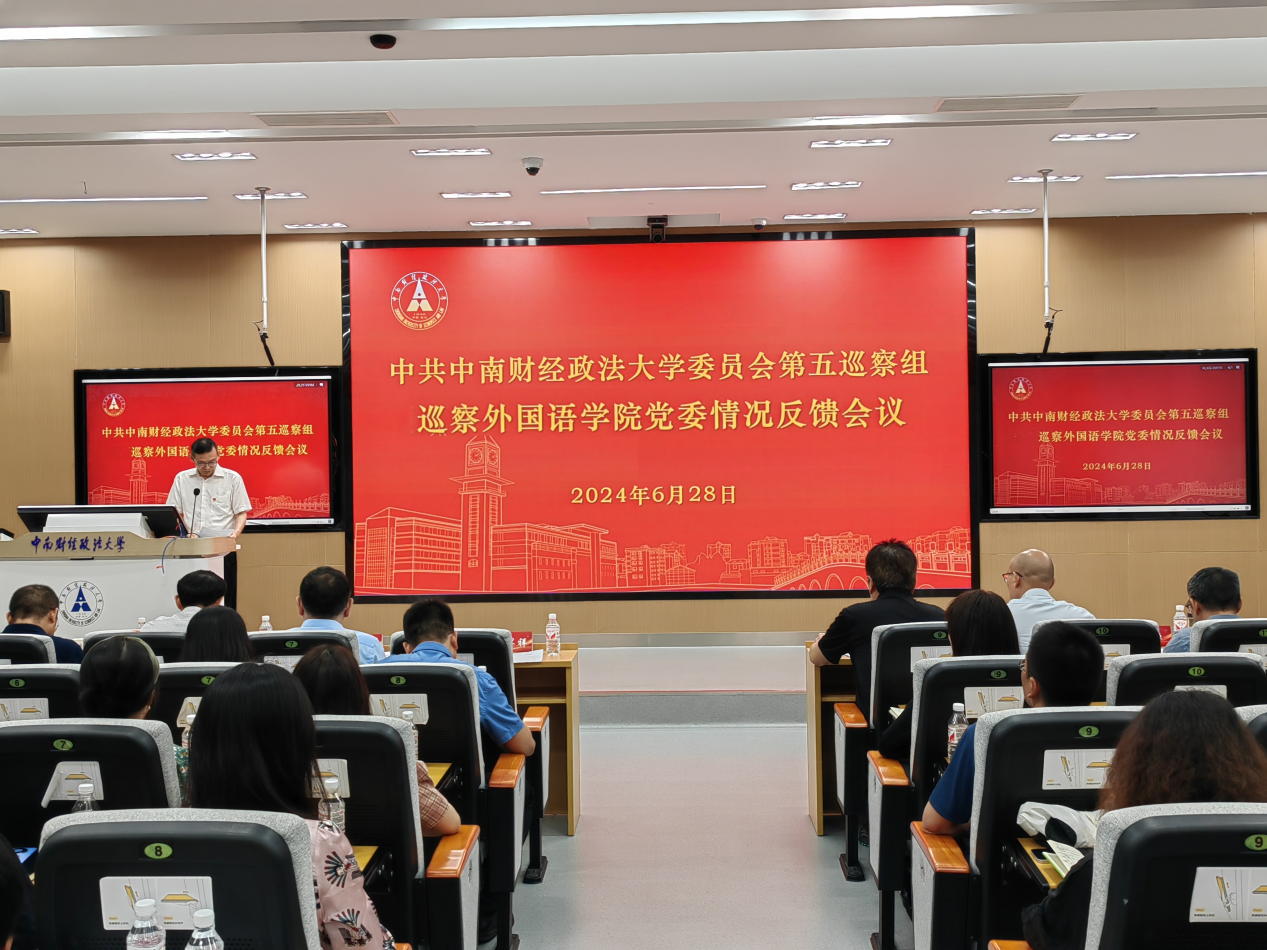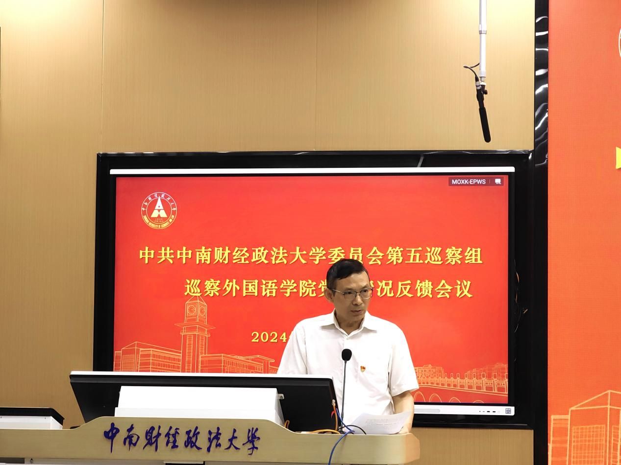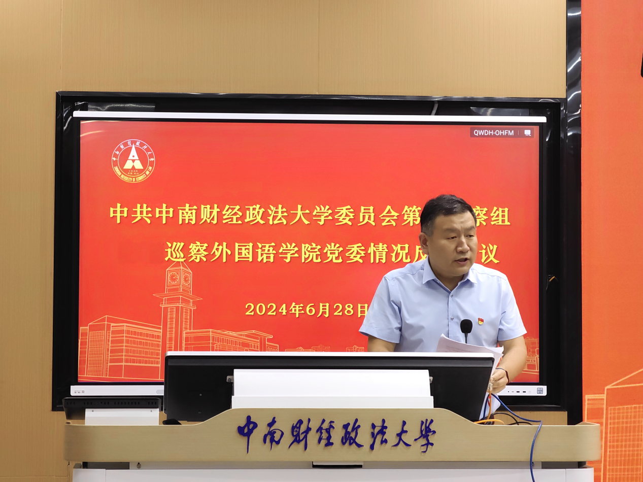 第五巡察组组长肖翠祥首先传达了《中共中南财经政法大学委员会第一批巡察第五巡察组巡察外国语学院党委的反馈意见》,通报了巡察组对外国语学院党委及领导班子的总体评价,对巡察中所发现的问题逐一进行了通报,并提出了有针对性的整改意见。