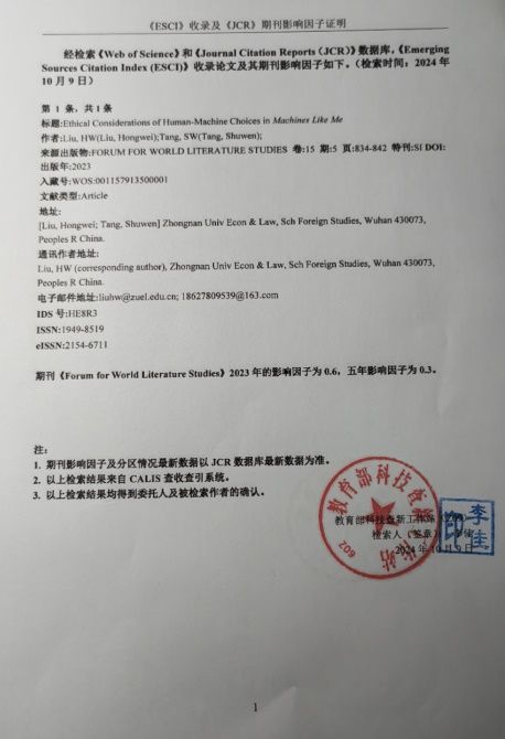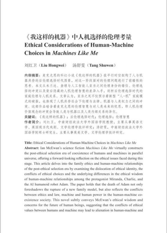 (通讯员 汤舒雯)近期,学院2022级英语语言文学专业硕士研究生汤舒雯与导师刘红卫教授合撰的论文“Ethical Considerations of Human-Machine Choices in Machines Like Me”在国际知名期刊Forum for World Literature Studies(Vol.15, No.5, 2023)上发表,并被权威数据库Emerging Sources Citation Index (ESCI)收录。2023年11月11-12日,“2023文学伦理学批评理论与实践论坛暨第三届文学伦理学批评国际研修班”在浙江大学举办。此次会议由浙江大学世界文学跨学科研究中心、国际文学伦理学批评研究会、Interdisciplinary Studies of Literature(A&HCI)与Forum for World Literature Studies(ESCI & Scopus)编辑部联合举办。在导师刘红卫教授的指导下,汤舒雯同学参加了此次国际学术会议,并在分会场做了学术报告。会后,经专家评审,论文被推荐至《世界文学研究论坛》编辑部,经过多轮精心修订与打磨,该论文最终成功发表。