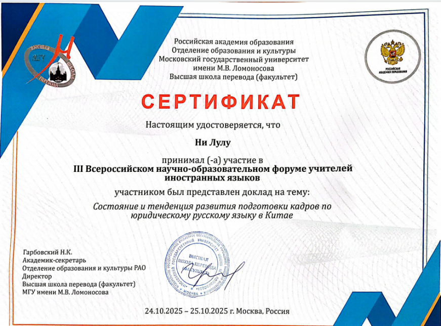 (通讯员 倪璐璐)2025年10月24-25日,莫斯科金秋时节,由俄罗斯教育科学院和莫斯科国立罗蒙诺索夫大学高级翻译学院联合举办的第三届全俄外语教师论坛顺利开展。我院俄语专业倪璐璐副教授利用在普希金语言大学访学便利,参加了此次论坛并作发言。